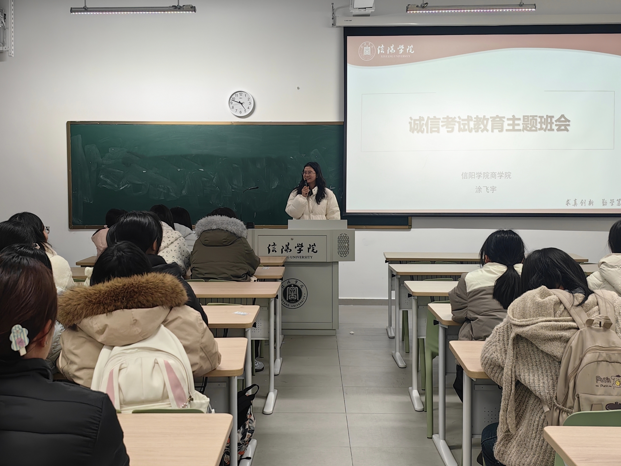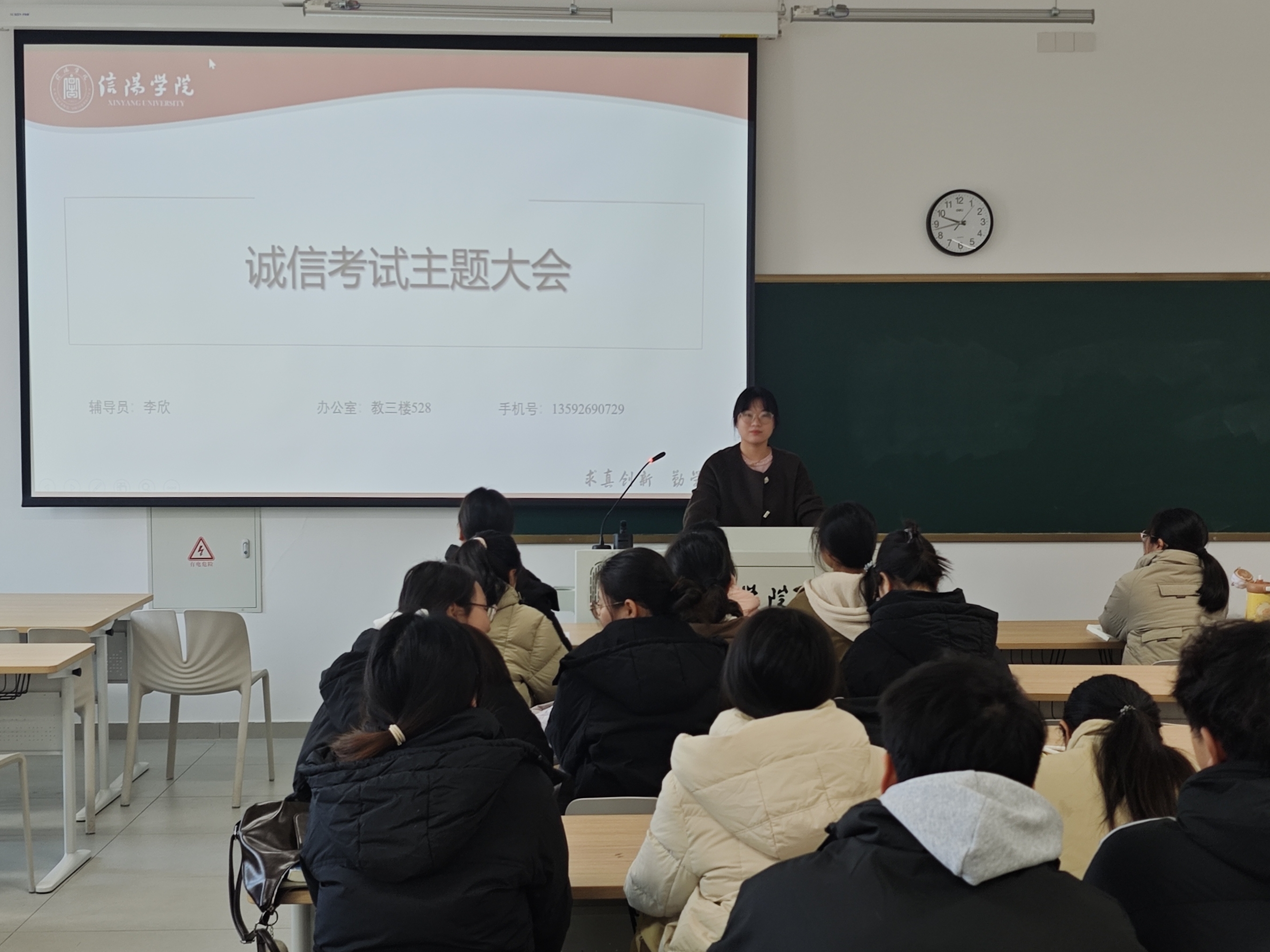 班会上,辅导员们紧扣学校考试管理相关规定,从考试违纪、作弊行为的具体界定入手,详细解读了警告、记过、留校察看等不同层级的处分措施,重点强调了作弊行为对毕业证、学位证发放的直接影响,层层递进划清考试“红线”,让学生清晰知晓违规违纪的严重后果。同时,辅导员结合考试作弊典型案例以及高考、专升本考试中的违纪处理实例,直观剖析了作弊行为对个人学业发展、品德声誉造成的长远危害,引导学生树立诚信应考的正确观念。活动最后,全体学生郑重签署《诚信考试承诺书》,以书面形式庄严承诺遵守考试纪律、杜绝作弊行为,将诚信应考的理念内化于心、外化于行。