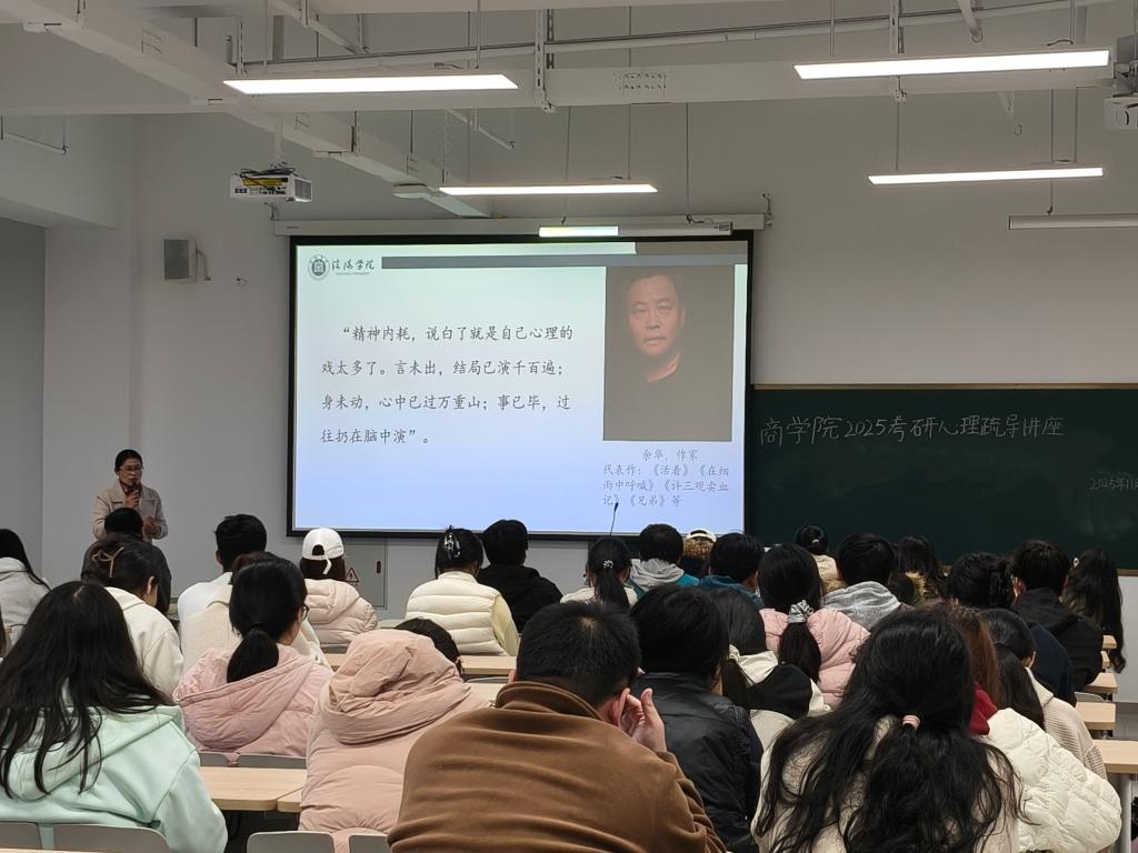 为帮助考研学子缓解备考压力、调整心理状态,以积极乐观心态迎战考研,11月7日下午,商学院在教三楼418教室举办“暖心护航考研路,心理疏导助前行”考研心理疏导专题讲座。本次讲座特邀商学院心理顾问武瑞芬老师担任主讲,100余名考研学生代表参加活动。